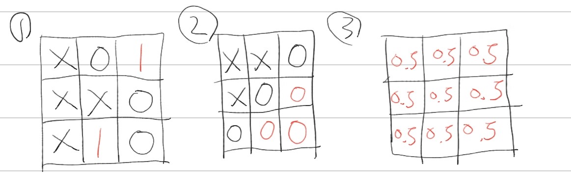X로 플레이한다고 가정했을 때, 1번의 경우 모든 state에서 이길 확률은 1이되고(이미 이겼기 때문에), 2번의 경우 모든 state에서 이길 확률은 0이된다(이미 졌기 때문에). 마지막으로 3번의 경우 아직 게임을 시작하지 않은 상태로 모든 state에서 이길확률은 0.5다.