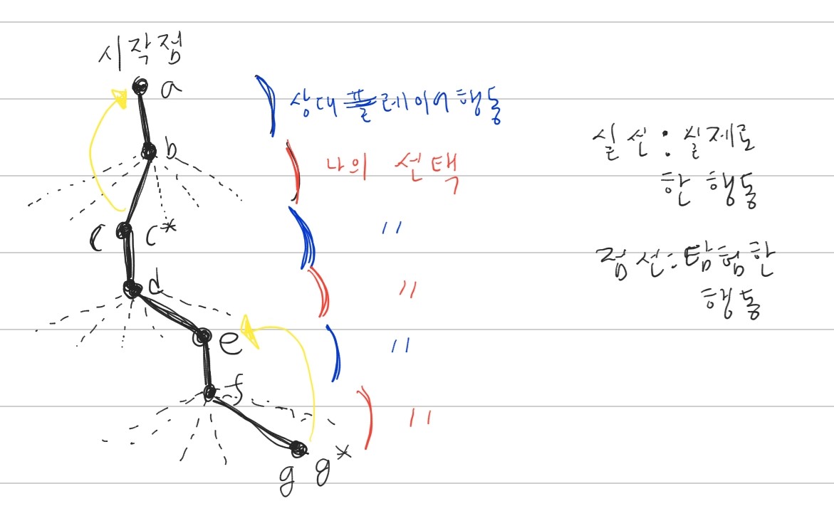 플레이어는 탐험으로 여러가지를 선택할 수 있고 이중에 하나를 선택한다. 플레이어의 두번째 선택인 e는 가장 높은 값을 주지 않지만 탐험으로 선택한 행동이다. 그래서 위의 value function 업데이트식을 사용해서 state를 업데이트하지 않는다. 그 외의 나머지 플레이어의 선택은 가장 높은 값을 주는 선택이므로 가치함수 업데이트 식을 사용해 이전 state를 나중 state값을 이용해 업데이트 시킨다