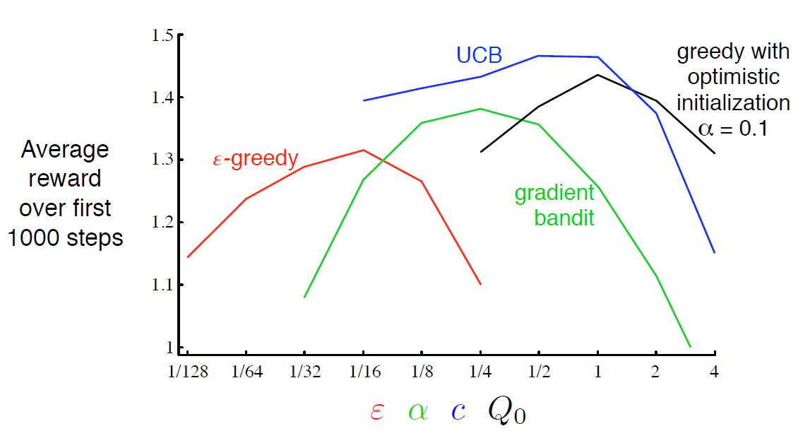 이런 방법들 중 어떤게 가장 최선인지는 어려운 질문이다. 우리는 10-armed testbed를 이용해 이것들의 성능을 비교해봤다. 아래의 그래프를 통해 알고리즘과 파라미터 세팅에 따른 성능을 보여준다. 그림 2.6은 이번 챕터에서 배운 다양한 bandit 알고리즘들과 각 함수의 고유한 파라미터가 x축에 나와있다. 이런 그래프를 parameter study라 부른다. 모든 알고리즘들은 고유의 파라미터 값들의 중간정도에서 가장 좋은 결과를 보여준다.