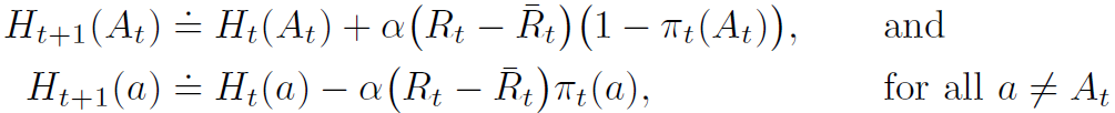 \( \alpha \) > 0인 스텝사이즈 파라미터, \( {\overline{R}}_{t} \in \mathbb{R} \)는 모든 시각 t를 제외한 reward들의 평균. section 2.4처럼 incremental하게 계산 가능하다. \( {\overline{R}}_{t} \)는 reward와 비교하는 baseline이다. reward가 baseline보다 높다면 \( {A}_{t} \)를 선택할 확률은 더 높아진다. reward가 baseline보다 작다면 확률은 작아진다.