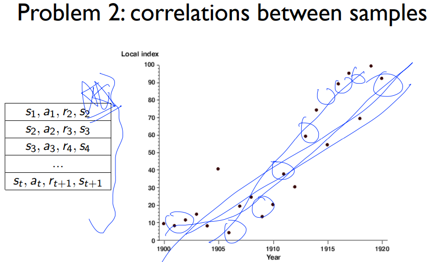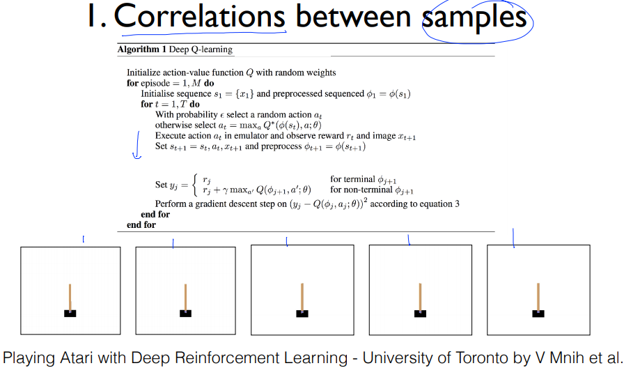 일단 첫번째로 샘플들간의 상관관계가 있는데 내가 카트폴을 training 시킨다고 했을 때, 카트폴이 움직일 때 정말 조금조금씩 움직이므로 이렇게 연속적으로 받은 데이터들은 굉장히 유사할 것이다. 그래서 이 데이터(샘플)들 간에 연관성이 있다는 얘기이다.
