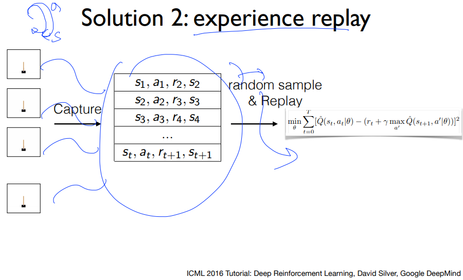 두번째로 샘플들간의 상관관계를 해결하는 법은 일단 샘플들을 수집해 저장을 해놓고 여기서 랜덤하게 샘플들을 몇개 뽑아 배치로 학습시키는 것이다. 그러면 아래의 그림처럼 상관관계가 없는 데이터들로 학습을 시켜 전체데이터와 유사하게 학습을 할 수 있다.