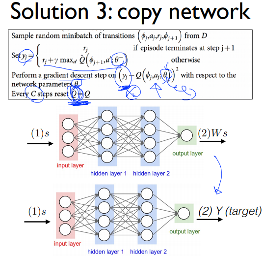 세번째는 y값이 계속 변하는 문제였다. 여기서는 이 문제를 해결하기 위해 target network를 분리시킨다. 그림처럼 Q값을 예측하는 네트워크와 target을 알려주는 네트워크를 따로 두는 것이다. 그러면 원래 네트워크를 업데이트해도 타겟 네트워크에는 변화가 없어 stationary target이 된다.