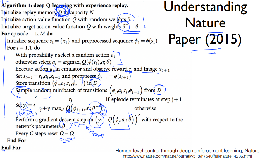 이 전체적인 DQN 알고리즘을 보면 리플레이 메모리를 만들고 Q 네트워크를 초기화시키고 타겟 Q 네트워크에 그 값을 복사한다. 각 state가 들어오면 전처리를 하고 action을 선택, reward를 받고, 다음 state도 전처리를 해서 리플레이 메모리에 넣는다. 리플레이 메모리에 어느정도 데이터가 쌓이면 미니배치로 Q네트워크를 업데이트한다. C step마다 업데이트한 Q네트워크를 타겟 네트워크에 복사한다.