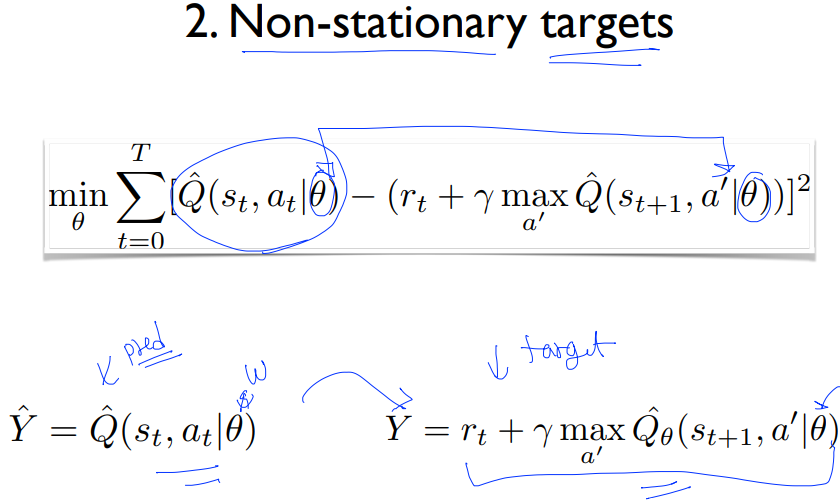 두번째로는 이 y(label)값이 계속 변하는 것이다. 예측과 정답이 같은 신경망을 공유하기 때문에 학습하며 신경망을 업데이트하면 정답도 같이 변하게 되는 것이다. 이 문제도 해결을 해야 한다.